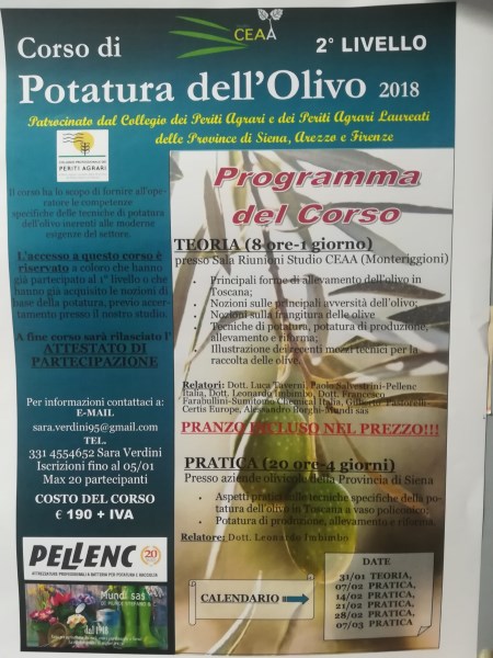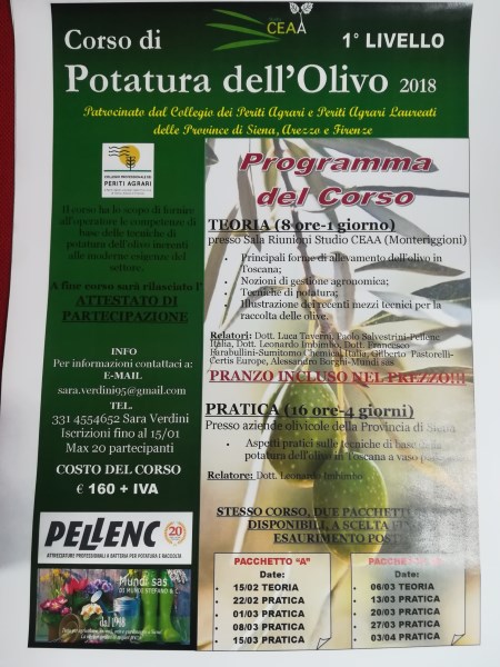 Mundi e Pellenc sponsorizzano il corso di primo e secondo livello di potatura dell'olivo, patrocinato dal Collegio dei Periti Agrari e Periti Agrari Laureati delle province di Siena, Arezzo e Firenze. Sia il corso di primo che di secondo livello saranno strutturati in due fasi: una prima parte teorica e una seconda pratica, a fine corso sarà rilasciato l'attestato di partecipazione.